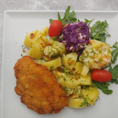 Filet z morszczuka zapiekany w sosie śmietanowo-czosnkowym, ziemniaki, surówka +...