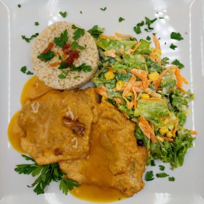 Obiad dnia: Kieszonka z piersi kurczaka nadziewana szynką i serem,...