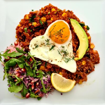 Quinoa po meksykańsku z jajkiem sadzonym, avocado, limonką i surówką...