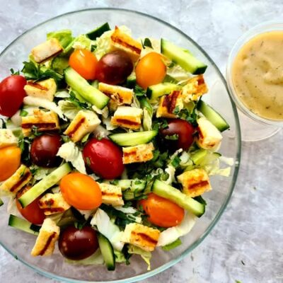 Sałatka dnia : z grillowanym halloumi, oliwkami, pomidorkami koktajlowymi, rukolą,...